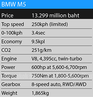 People who love the sensation of their backs forced back into their seats upon pressing the gas flat from standstill can also exploit the launch control the M5 has to offer. Yes, the M5 is supercar-quick, just that is has the basic package of a three million baht executive sedan.
