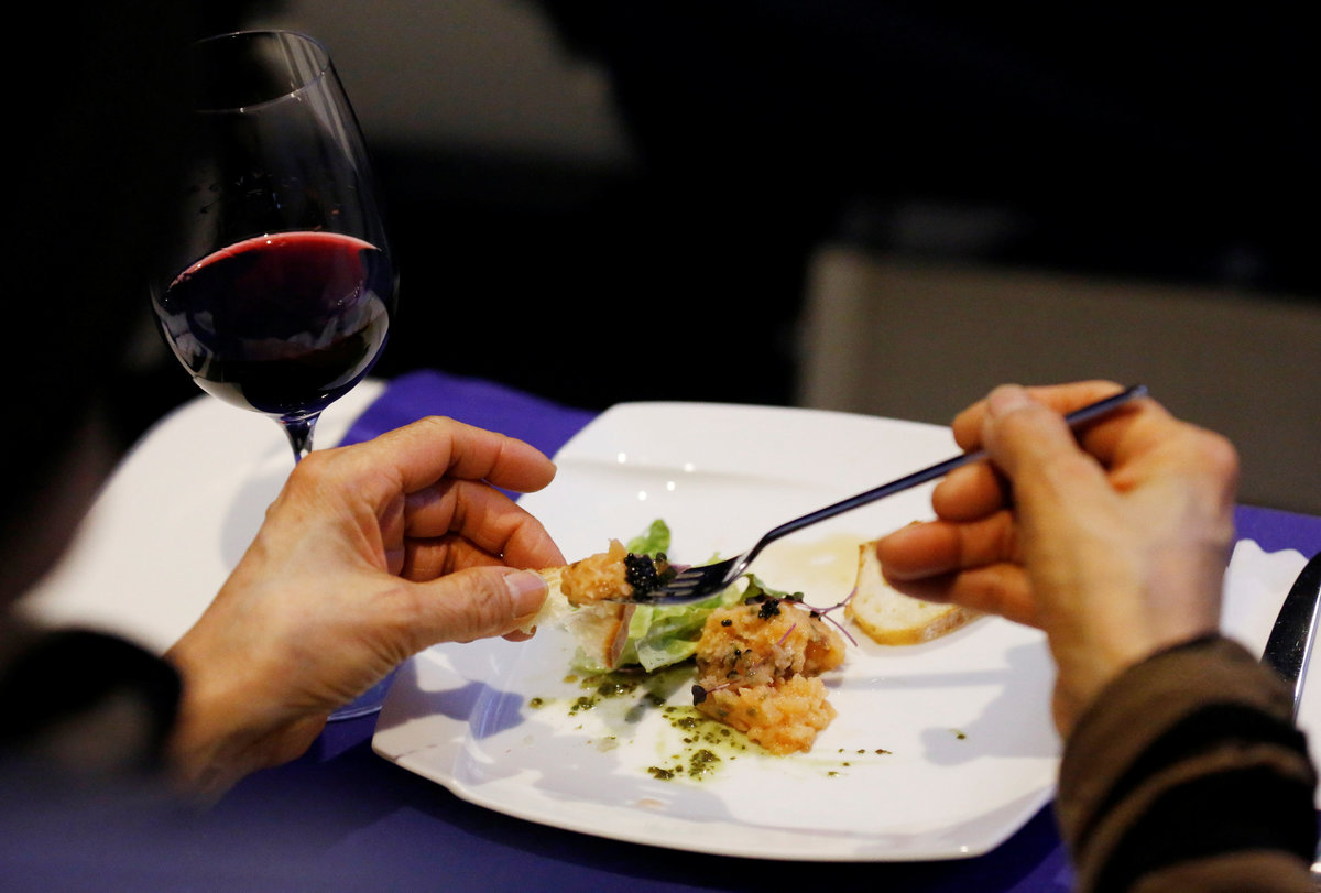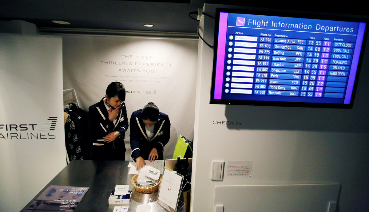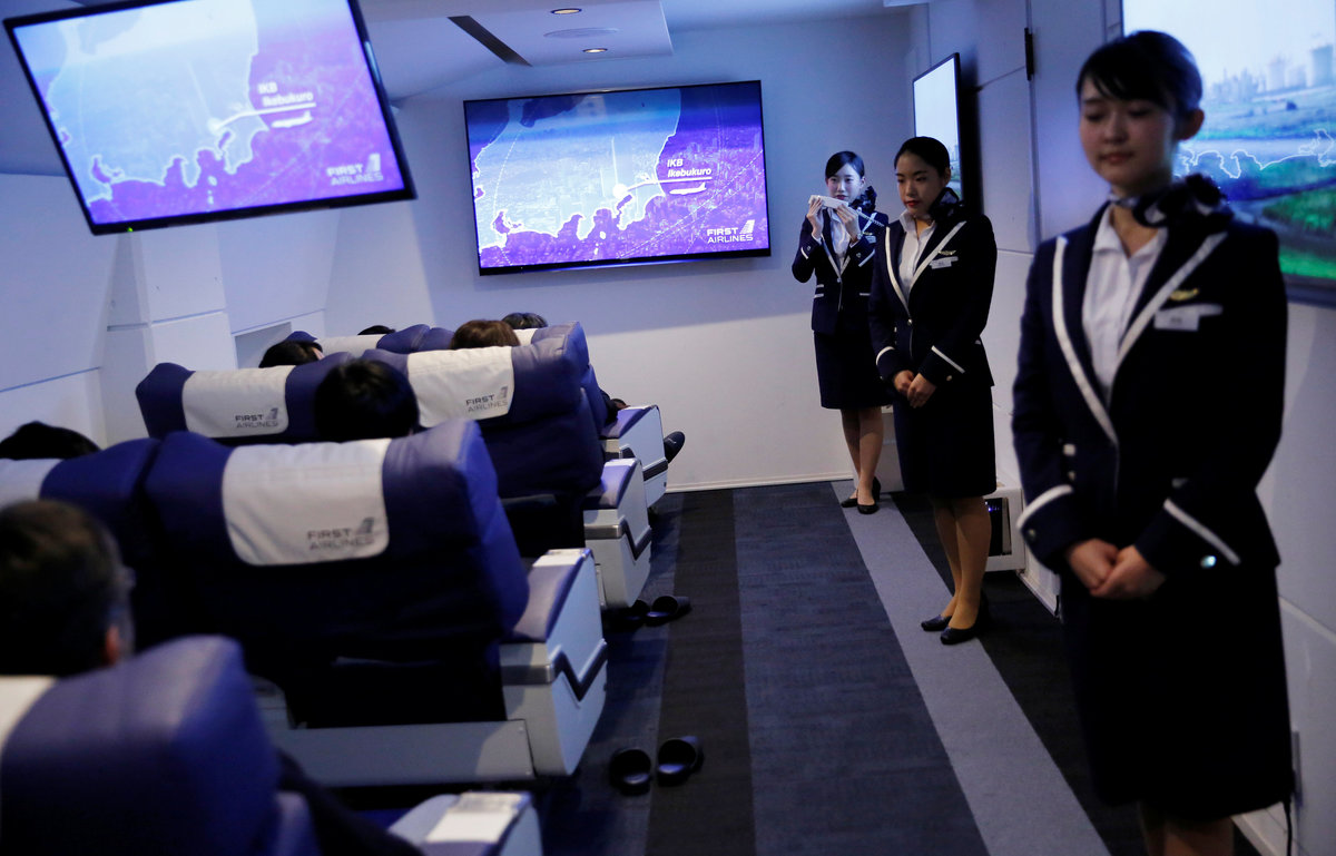 Staff dressed as flight attendants, perform a safety demonstration at the "First Airlines", virtual first-class airline experience facility in Tokyo, Japan February 14, 2018. Picture taken February 14, 2018. REUTERS/Toru HanaiStaff dressed as flight attendants, greet guests at the "First Airlines", virtual first-class airline experience facility in Tokyo, Japan February 14, 2018. Picture taken February 14, 2018. REUTERS/Toru HanaiA guest eats first-class meal at the "First Airlines", virtual first-class airline experience facility in Tokyo, Japan February 14, 2018. Picture taken February 14, 2018. REUTERS/Toru HanaiStaff dressed as flight attendants, serve drinks to guests at the "First Airlines", virtual first-class airline experience facility in Tokyo, Japan February 14, 2018. Picture taken February 14, 2018. REUTERS/Toru HanaiA staff dressed as flight attendant, serves appetizers to guests at the "First Airlines", virtual first-class airline experience facility in Tokyo, Japan February 14, 2018. Picture taken February 14, 2018. REUTERS/Toru Hanai
