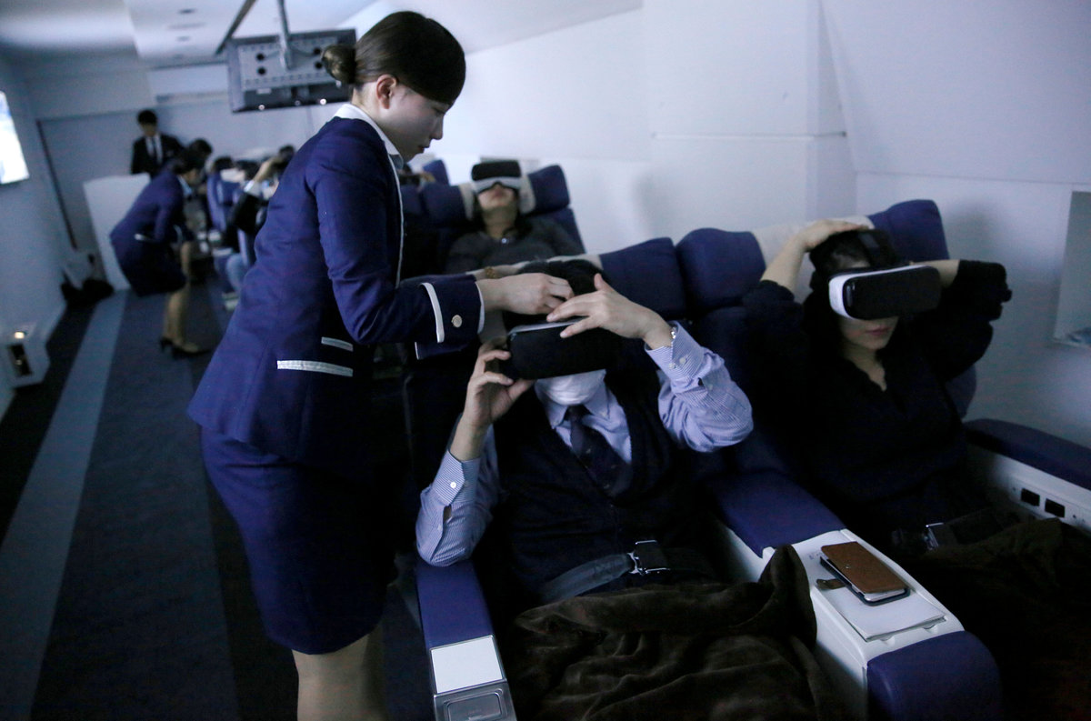 Staff dressed as flight attendants, help guests to wear virtual reality (VR) goggles at the "First Airlines", virtual first-class airline experience facility in Tokyo, Japan February 14, 2018. Picture taken February 14, 2018. REUTERS/Toru Hanai