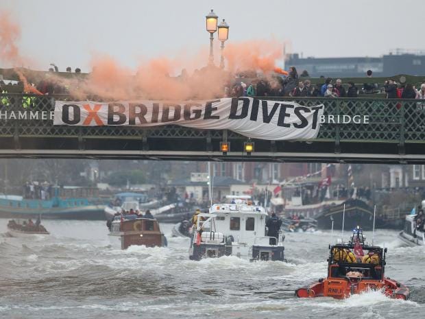 Student environmental activists interrupted this year’s Oxford and Cambridge Boat Race to protest against both universities’ investment in fossil fuel companies.