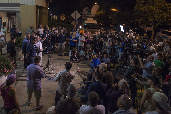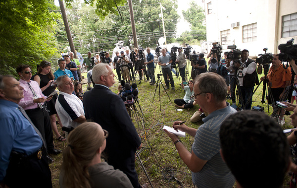 The district attorney's midnight announcement at Logan Square Shopping Center, near New Hope, drew about 50 to 60 spectators. Few of them knew the four missing men personally; all lived nearby and said they were shocked at what happened in their backyard and found it impossible to stay away.
