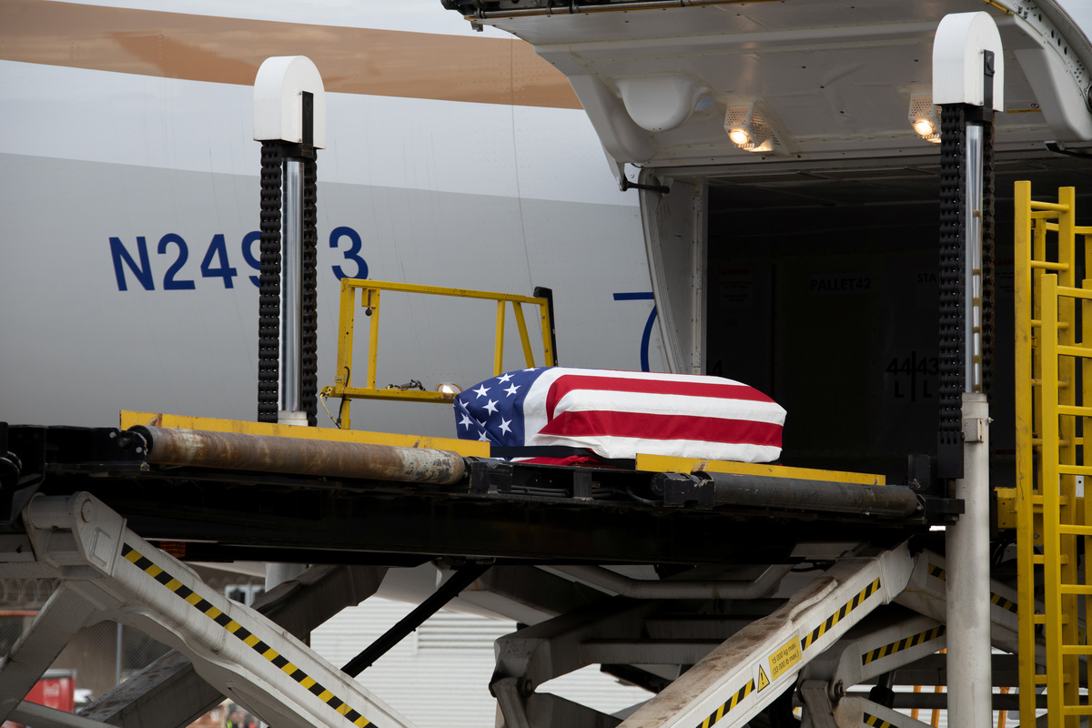Mourners gathered on the tarmac at Sydney Airport to see off Captain Ian H. McBeth, 44, of Great Falls, Montana, and First Officer Paul Clyde Hudson, 42, of Buckeye, Arizona, as their flag-draped caskets were lifted into aircraft for the journey home.