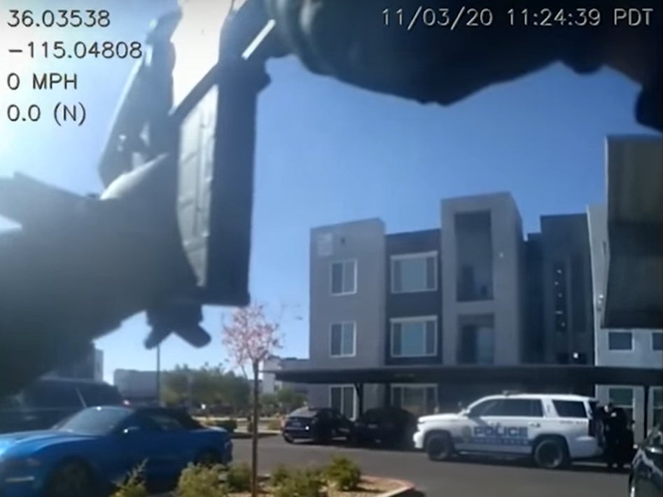 In the video released by Henderson Police Department, officers can be seen aiming rifles at the car while a woman says off-camera that Mr Bourne was pointing his weapon at the boy's head.