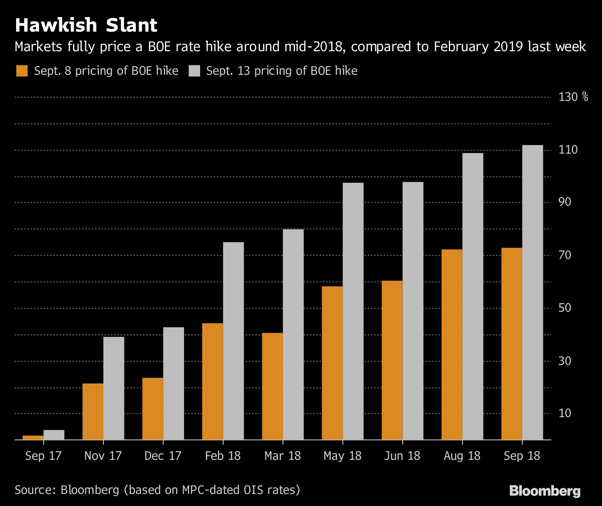 - A hawkish re-pricing of BOE rates will, however, only likely “offer the pound a one-time boost,” as Brexit will once again be the main driver in October ahead of key political events