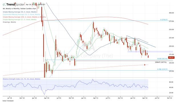 On Nov. 9, 2020, Boeing ripped higher, gapping up about 13% and beginning a multiweek upside rally. While that was a powerful move, it left a gap at $158.47 — a gap that has sat unfilled for almost a year and a half.