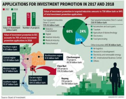 Nonetheless, applications in the government's flagship Eastern Economic Corridor (EEC) initiative slightly dropped from 436 projects in 2017 to 422 projects in 2018.