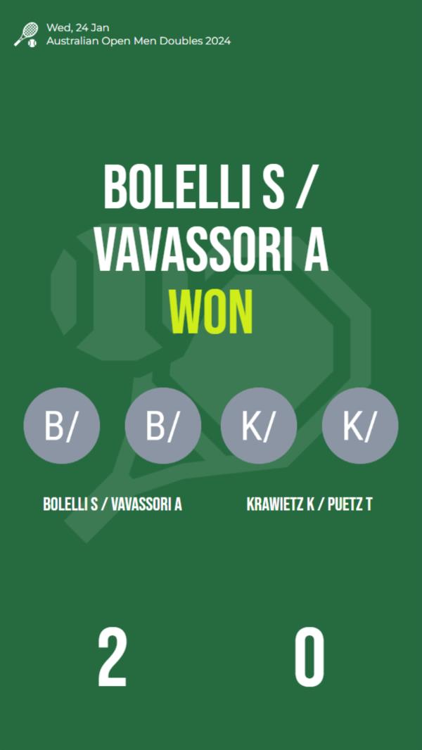 The Australian Open Men Doubles 2024 quarterfinals match between Bolelli S / Vavassori A and Krawietz K / Puetz T was undoubtedly a tennis spectacle. The skill, strategy, and determination exhibited by both teams were commendable. Ultimately, Bolelli S / Vavassori A's clinical performance and superior statistics propelled them to victory, securing their spot in the semifinals. As the tournament progresses, the anticipation builds as we await more exhilarating matches and exceptional displays of tennis prowess.
