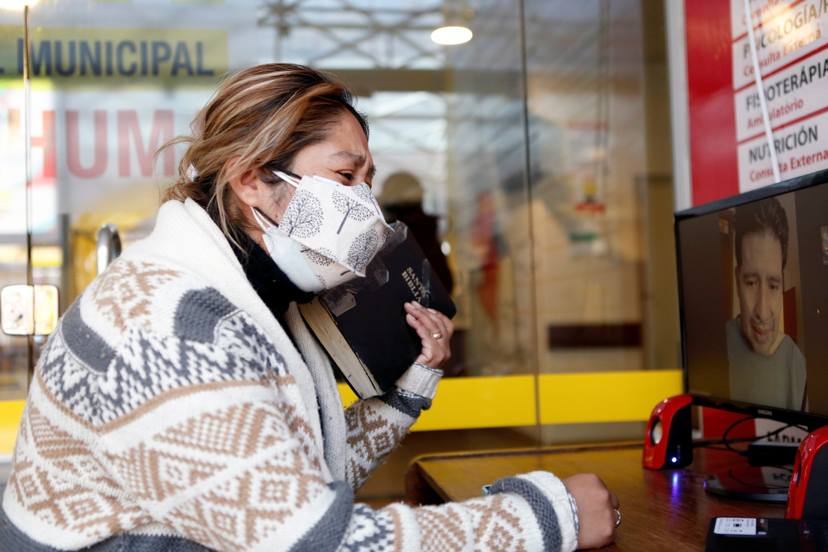 For Cinthia Quisbert Paredes, it has been the first time she has been separated from her husband since they were married seven years ago. Arriving at the hospital video booth, she can now see him for the first time in two weeks.