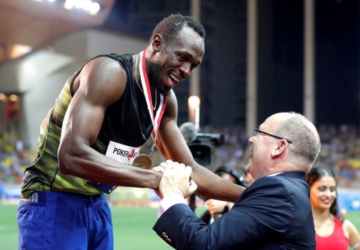 Athletics - IAAF Diamond League Herculis meeting - 100m Men - Louis II Stadium, Monaco - July 21, 2017. Prince Albert II of Monaco congratulates Jamaican sprinter Usain Bolt. REUTERS/Eric Gaillard