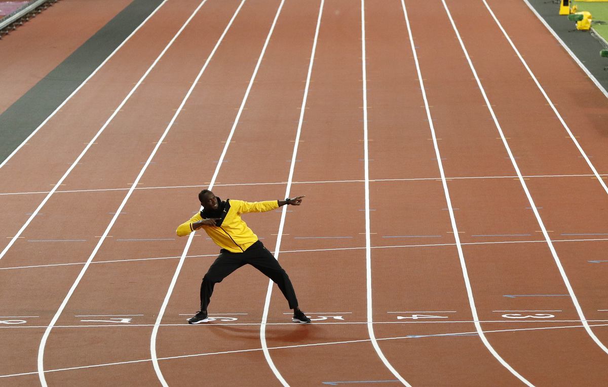 And after taking rather longer than the 9.63 seconds it took him to win the 100 metres crown here in 2012, he eventually stopped at the finish line and gave everyone his trademark lightning bolt impression.