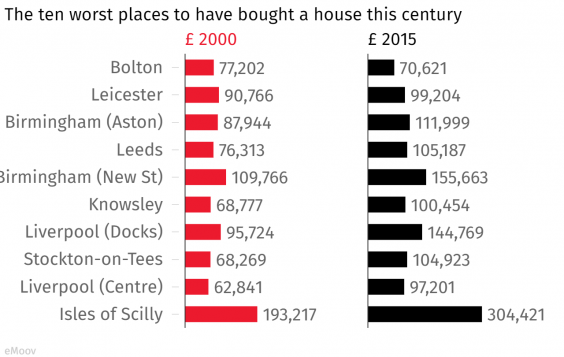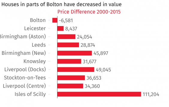 The centre of Bolton is the only place in England and Wales that saw house prices decrease this side of the millennium, according to research by the fixed-fee estate agent eMoov.