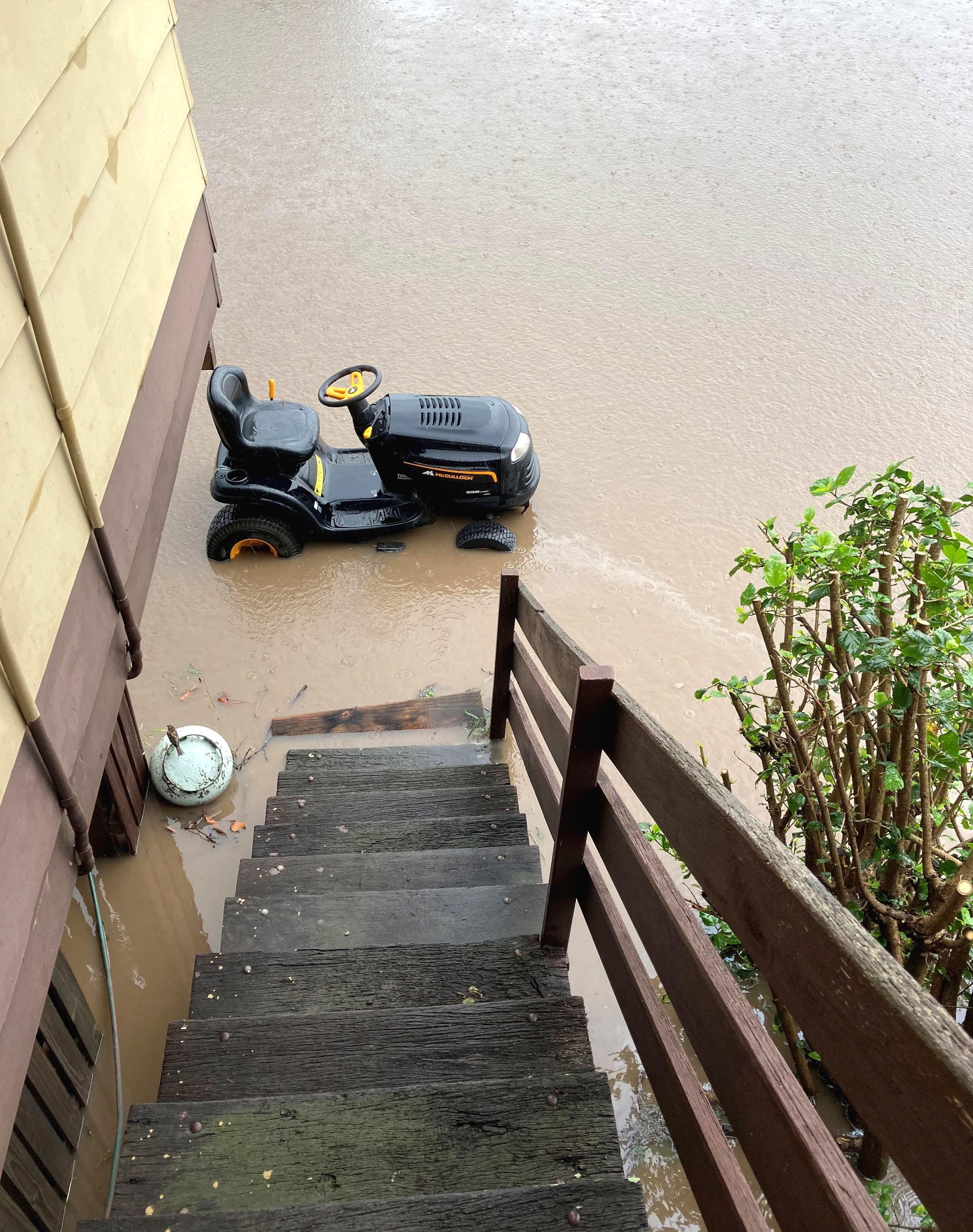 In Forest Hill, near Gatton, entire backyards were flooded and roads were blocked forcing residents to stay home from work. Water in David Purvis's yard was over knee deep.