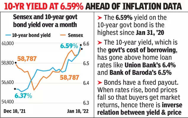 MUMBAI: Bonds fell to a pre-pandemic low on Monday even as the sensex surged over 1% to close 651 points higher and the rupee gained 27 paise. The cost of borrowing for the government, as reflected in the yield on 10-year bonds, rose to more than the home loan rates offered by most banks to a two-year high of 6.59%. While Union Bank of India’s loans start at 6.4%, Bank of Baroda is offering them at 6.5%.