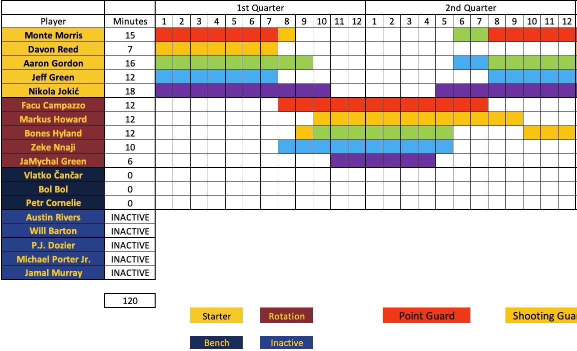 Halftime rotations as the Nuggets lead the Spurs 72-56.