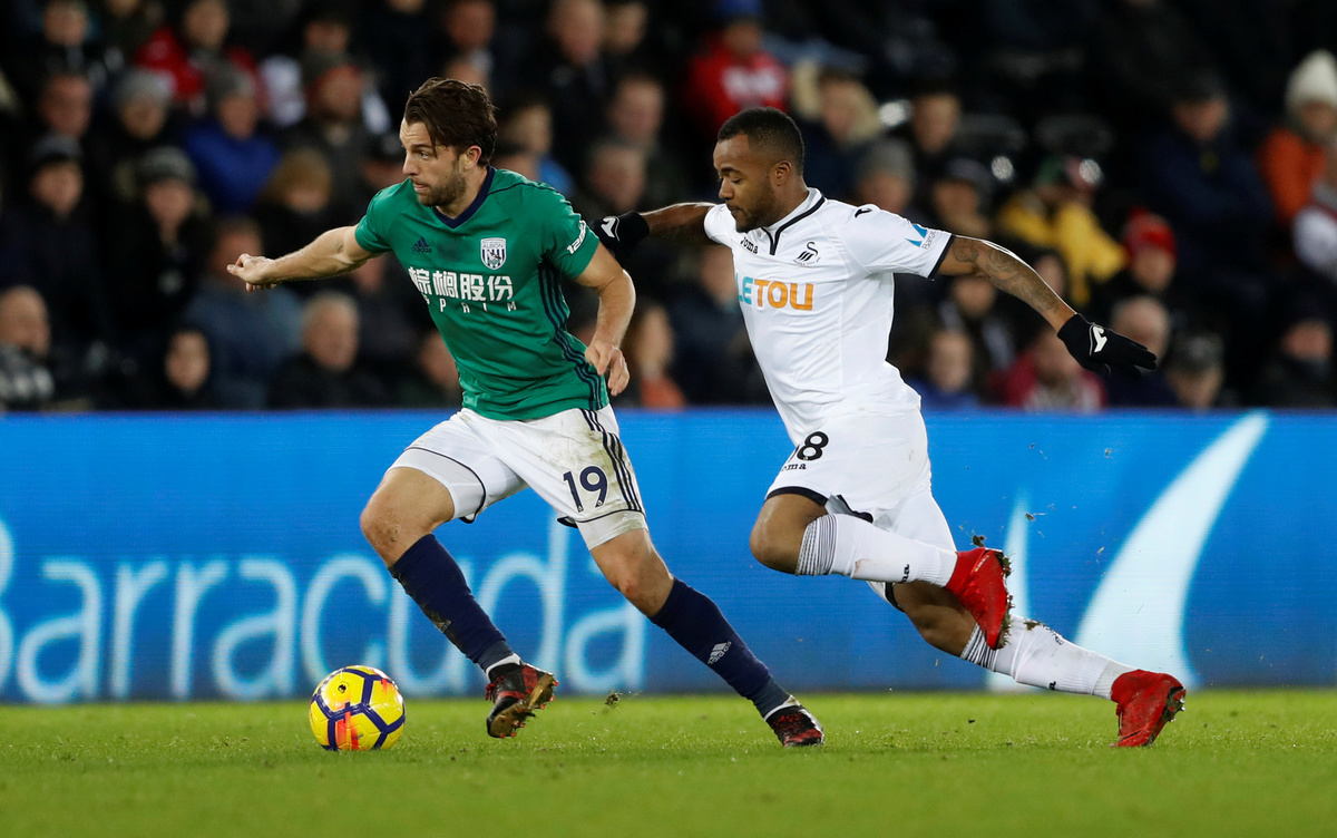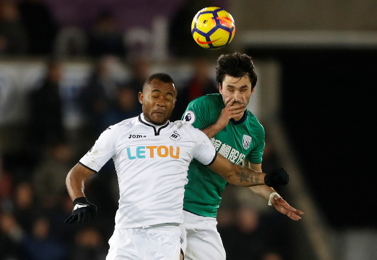 Soccer Football - Premier League - Swansea City vs West Bromwich Albion - Liberty Stadium, Swansea, Britain - December 9, 2017 West Bromwich Albion's Jay Rodriguez in action with Swansea City's Jordan Ayew Action Images via Reuters/Carl Recine