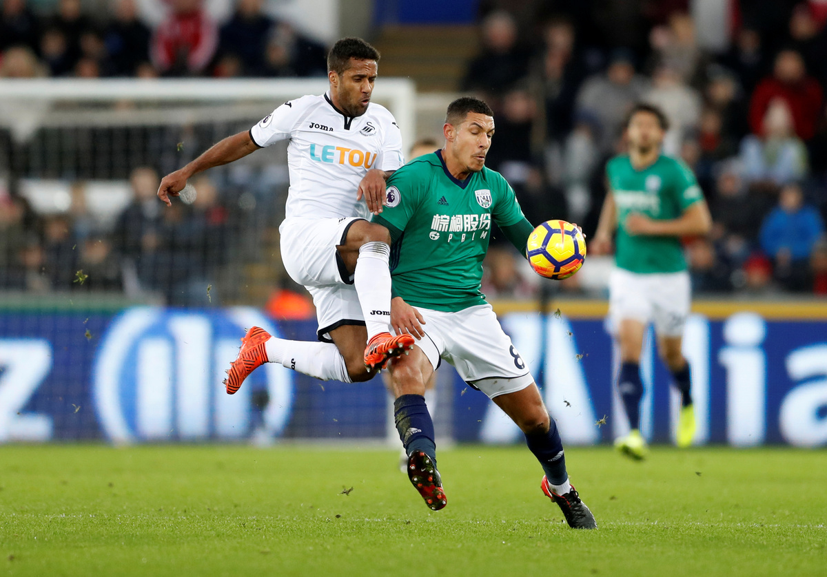 Soccer Football - Premier League - Swansea City vs West Bromwich Albion - Liberty Stadium, Swansea, Britain - December 9, 2017 West Bromwich Albion's Jake Livermore in action with Swansea City's Kyle Naughton Action Images via Reuters/Carl Recine Soccer Football - Premier League - Swansea City vs West Bromwich Albion - Liberty Stadium, Swansea, Britain - December 9, 2017 West Bromwich Albion manager Alan Pardew reacts Action Images via Reuters/Carl Recine Soccer Football - Premier League - Swansea City vs West Bromwich Albion - Liberty Stadium, Swansea, Britain - December 9, 2017 Swansea City's Jordan Ayew in action with West Bromwich Albion's Claudio Yacob Action Images via Reuters/Carl Recine