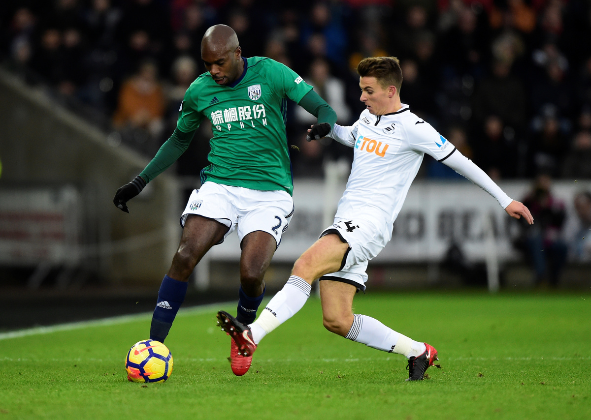 Soccer Football - Premier League - Swansea City vs West Bromwich Albion - Liberty Stadium, Swansea, Britain - December 9, 2017 West Bromwich Albion's Allan Nyom in action with Swansea City's Tom Carroll REUTERS/Rebecca Naden