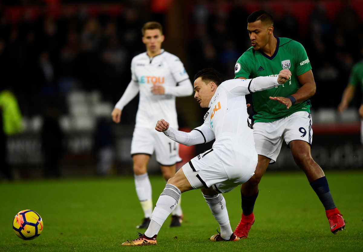 Soccer Football - Premier League - Swansea City vs West Bromwich Albion - Liberty Stadium, Swansea, Britain - December 9, 2017 Swansea City's Roque Mesa in action with West Bromwich Albion's Salomon Rondon REUTERS/Rebecca Naden