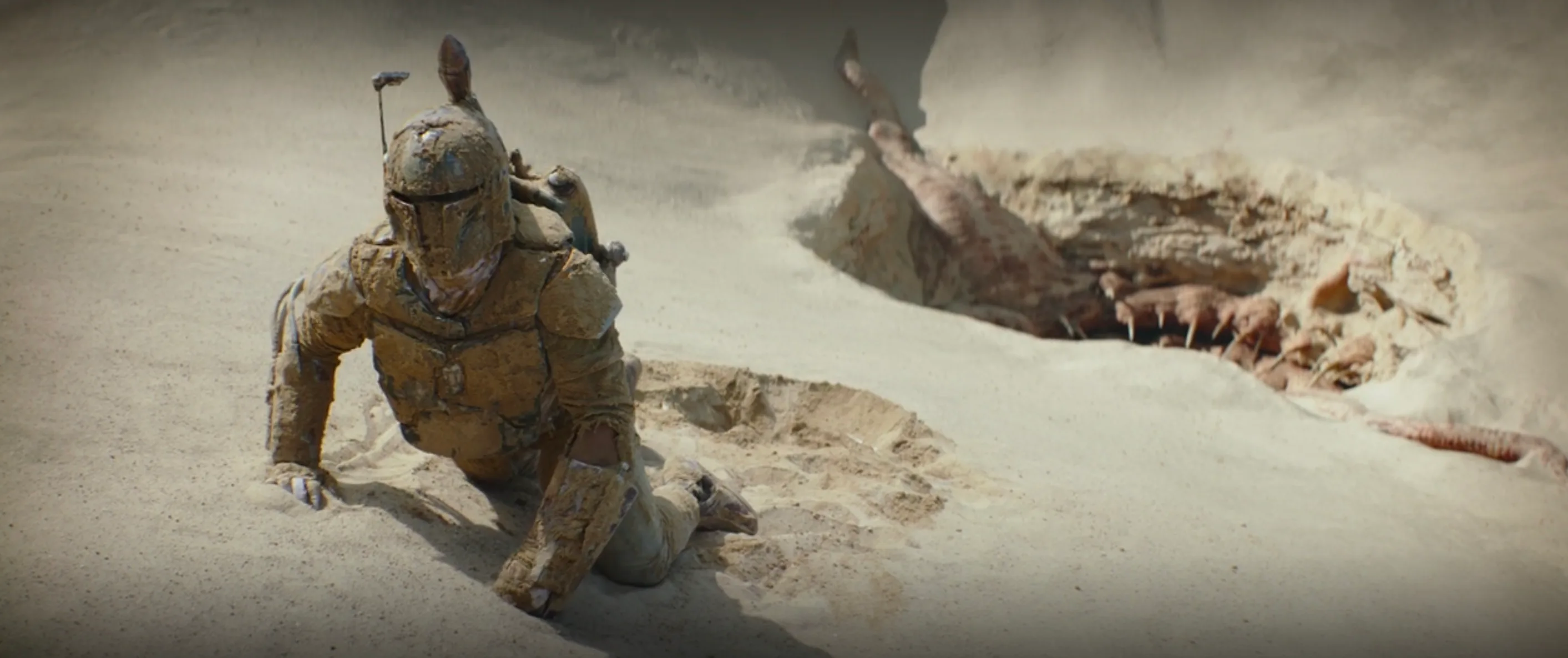 But, we now have some glimpse into how he lived out in the desert all those years. In The Mandalorian Season 2, Fett was rocking a Tusken Gaderffii stick, and it looks like we have a good sense of how he got it. By the end of this episode’s flashback, Fett has earned the respect of the Tusken Raiders, having saved one of the Tusken children from a four-armed sand monster. Unlike Anakin Skywalker, Boba Fett didn’t kill a Tusken child when he was freed, he saved the kid, and. seemingly, started to get his mojo back.
