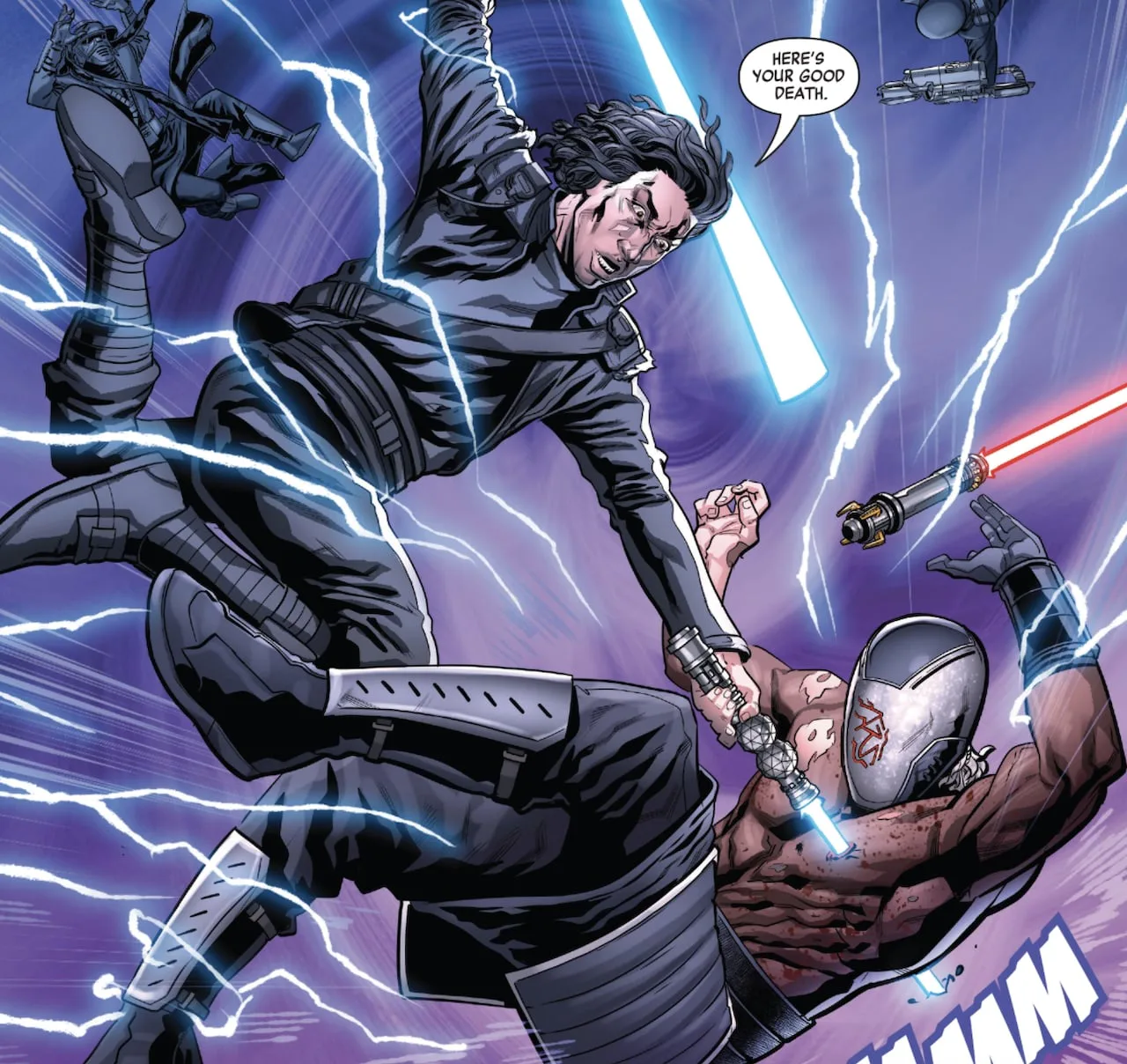 The crossover comics event picked up after Han Solo had been frozen in carbonite, with Boba Fett sparring with other characters control of the resultant slab. Among the familiar faces appearing in the series was Ren, the leader of the Knights of Ren, as featured in The Rise of Skywalker and comic book series The Rise of Kylo Ren. In War of the Bounty Hunters, Ren is one of the many villains assembled by Qi’ra as part of Crimson Dawn’s agenda.