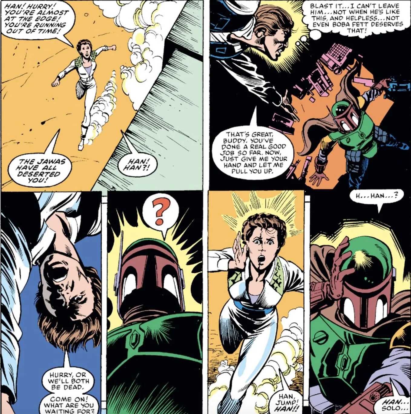 Mere months after falling into the Sarlacc pit, Star Wars #81 depicted Boba getting out with his armor intact but his memory gone. He wakes up in the cargo of a sandcrawler, then runs into Han and Leia. When he hears Leia call Han’s name, his memory is jogged and his original bounty hunter mission comes rushing back.