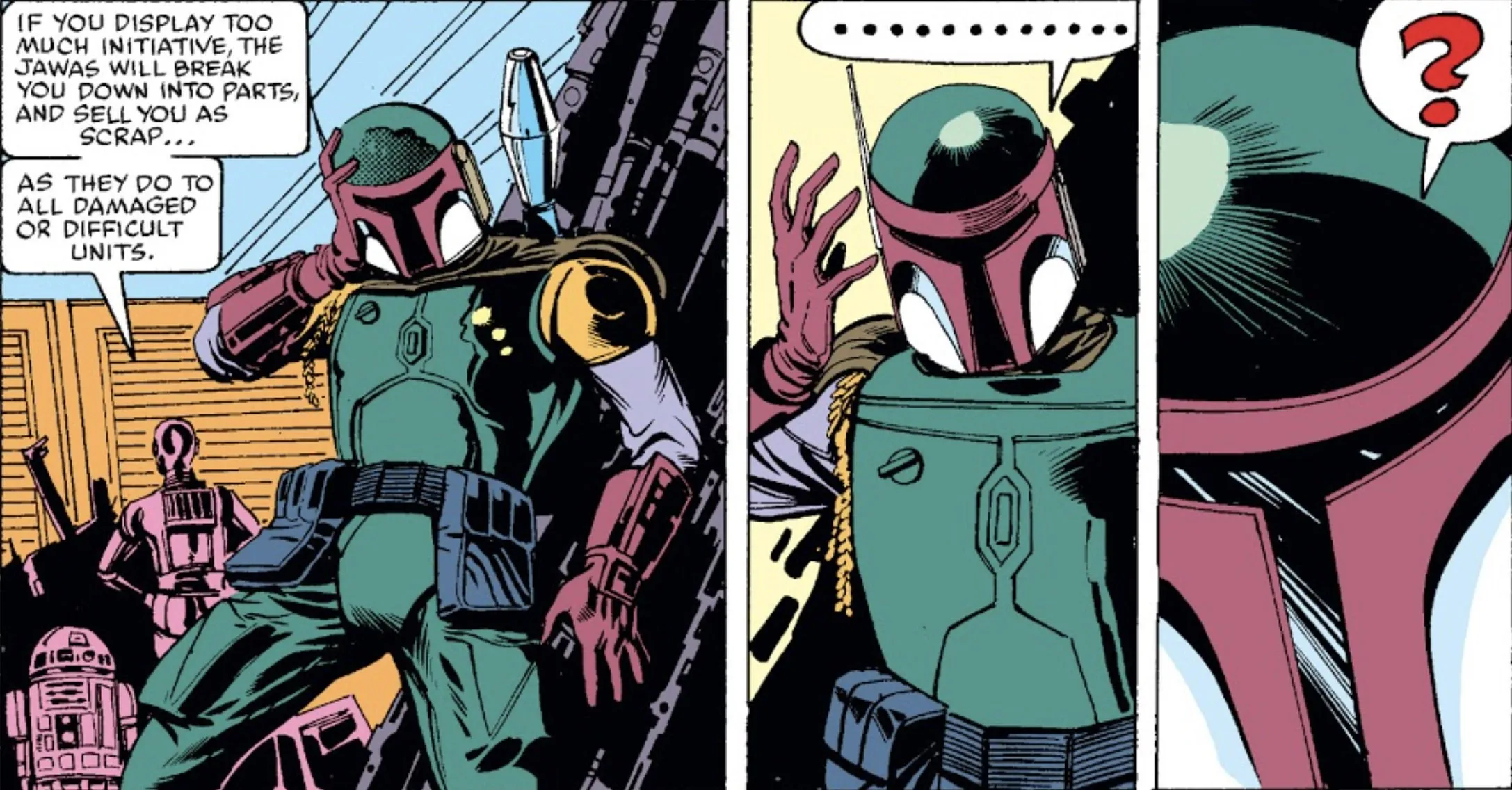 It may be ridiculous, but the early Star Wars comics were often silly. What better way to pay homage to them than having Boba Fett say, “Throw me in the Sarlacc Pit once, shame on you, Throw me in the Sarlacc Pit twice, shame on me”? It’s just the levity Boba’s grim demeanor could use.
