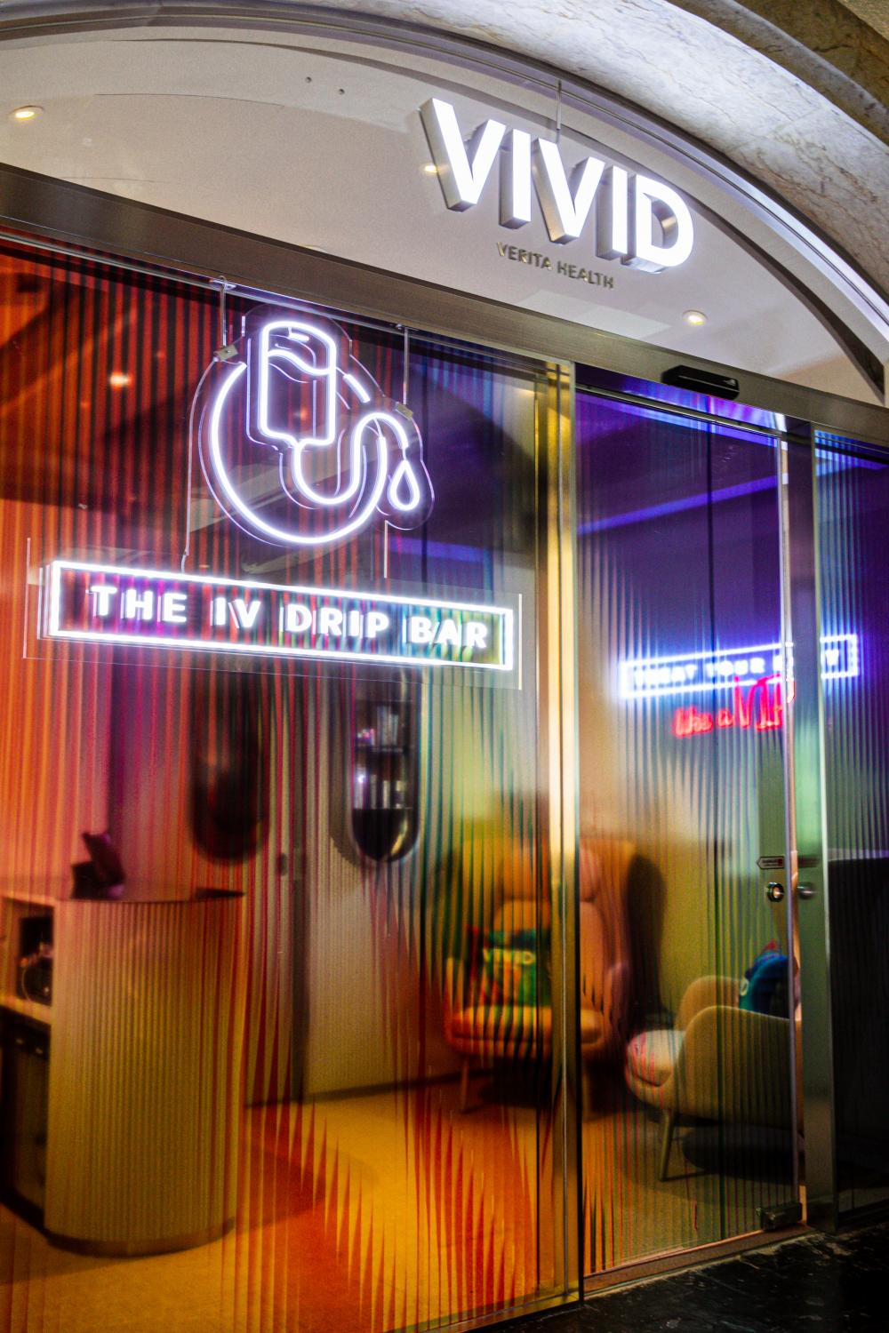 The elevated self-care relates to Vivid by Verita Health's credo, "Treat Your Body Like A VIP", emblazoned in LED luminescent lighting on the wall of the IV drip bar located in the courtyard of the Anantara Siam Bangkok Hotel.