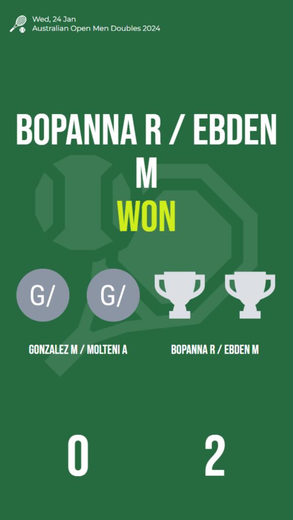 In a thrilling quarterfinal match at the Australian Open Men's Doubles 2024, the dynamic duo of Gonzalez M and Molteni A went head-to-head against Bopanna R and Ebden M. With intense rallies and impressive displays of skill, it was a match that kept the spectators on the edge of their seats. Ultimately, it was Bopanna R and Ebden M who emerged victorious in this gripping encounter.
