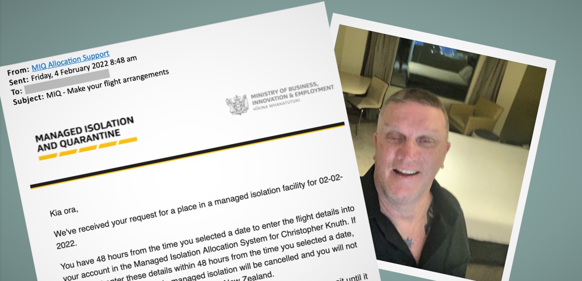 On Friday, February 4 – two days after he'd flown into Auckland International Airport and been transferred to Sudima Hotel – he received an email from MBIE asking him to enter his flight details for a place in managed isolation. "Once you have provided those details we will confirm that you have been allocated a space."