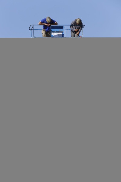 On the walls with rounded tops, two men in a lift tried to affix a three-sided hook over the top. After the hook repeatedly came loose, they managed to get it to hold on the westernmost wall, a tan, nonconcrete structure with a small, round tube on top built by W.G. Yates & Sons Construction Company of Philadelphia, Miss.