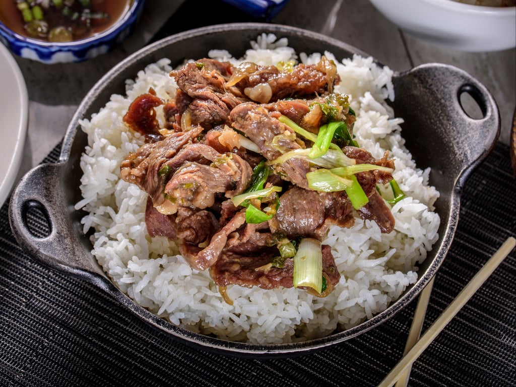 Neobiani, a dish of broad, thin slices of beef tenderised with shallow slits from a knife, was a feature of royal court cuisine during the Joseon dynasty in Korea (1392 to 1910) and a predecessor to today’s beloved bulgogi of very thinly sliced marinated grilled meat. This variation borrows from neobiani, but doesn’t require knife skills: well-marbled skirt steak is pounded thin and marinated in a tenderising sweet puree of Asian pear, onion, soy sauce and maple syrup. Bulgogi, which means “fire meat”, is best with the flame-licked char from a barbecue, but a hot frying or griddle pan on the stovetop would work in a pinch.