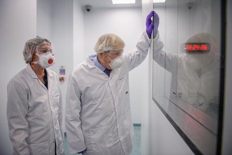 At the factory, Mr Johnson was pictured meeting the site director and holding equipment. He was wearing a mask, but conducted TV interviews with his face uncovered.