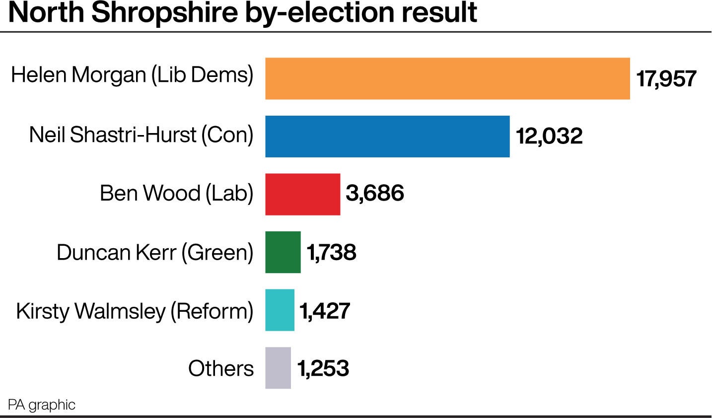 But Thursday’s result was even more crushing. The Lib Dems won North Shropshire by 5,925 votes over the Conservatives, in a swing of 34%.