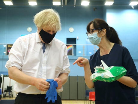 The nurse helping Mr Johnson at the Cwmbran vaccine site was heard politely saying “absolutely” during the awkward moment, having apologised for giving him “the smallest gloves”.