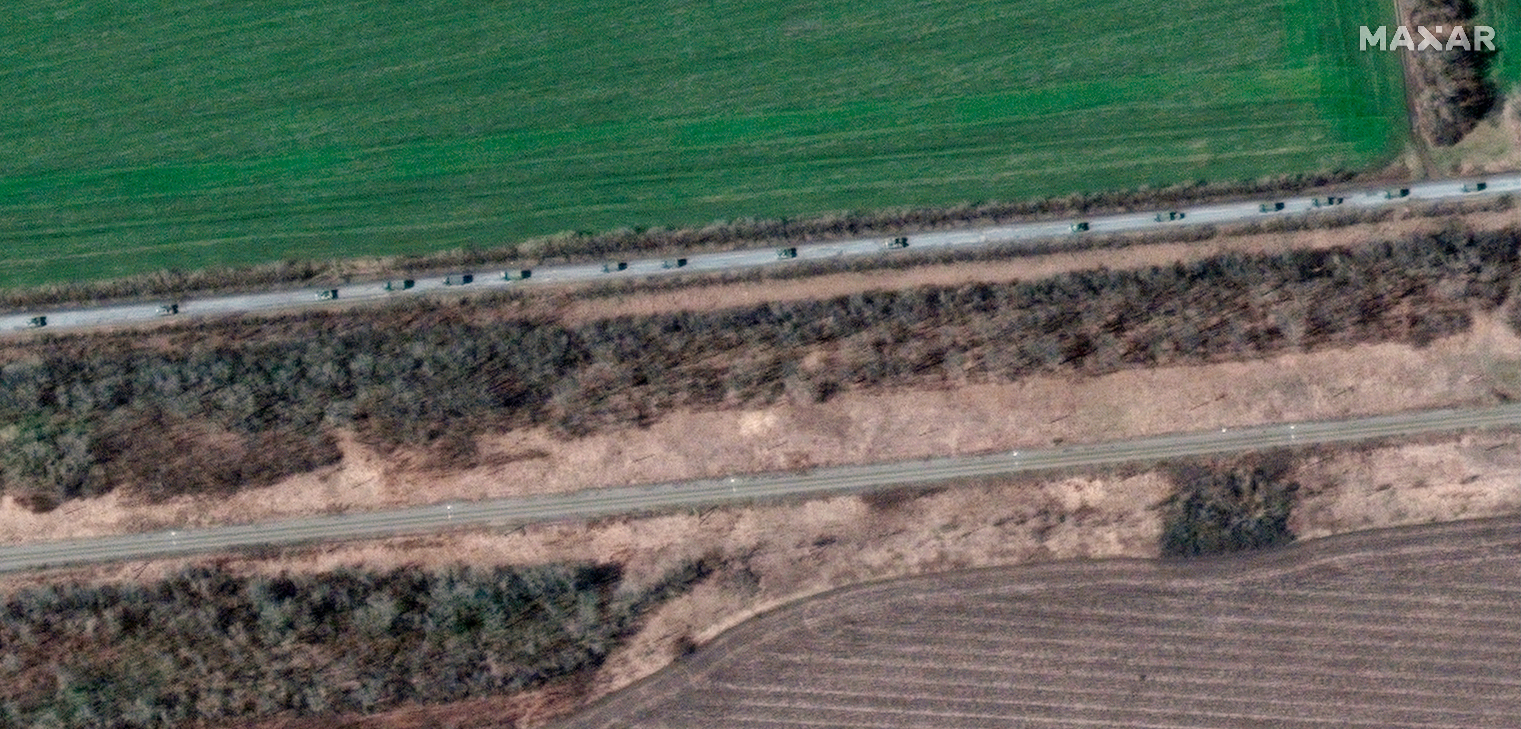 Newly released Maxar satellite imagery collected on Friday shows a 13 kilometre-long convoy of military vehicles headed south to the Donbas region through the Ukrainian town of Velykyi Burluk.