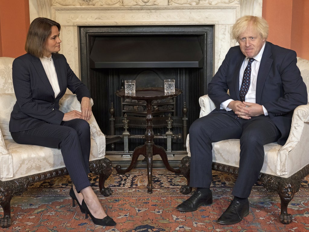 Boris Johnson said the UK is “on the side” of the Belarusian opposition leader Sviatlana Tsikhanouskaya, welcoming her to No 10 as international pressure continues to mount on the country’s authoritarian regime.
