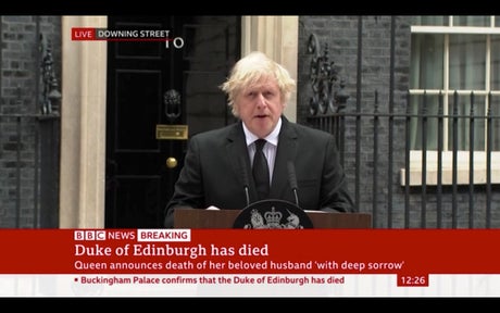 Wearing a black tie, but with his hair uncombed, Mr Johnson said he had received the news of Prince Philip’s death from Buckingham Palace “with great sadness”.