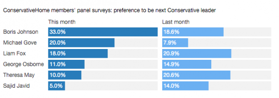 Mr Johnson is now favoured by a third (33 per cent) of Tory activists on the website’s panel, up by 14 points on the previous month’s survey.