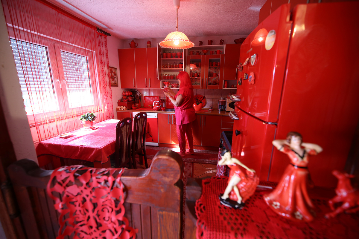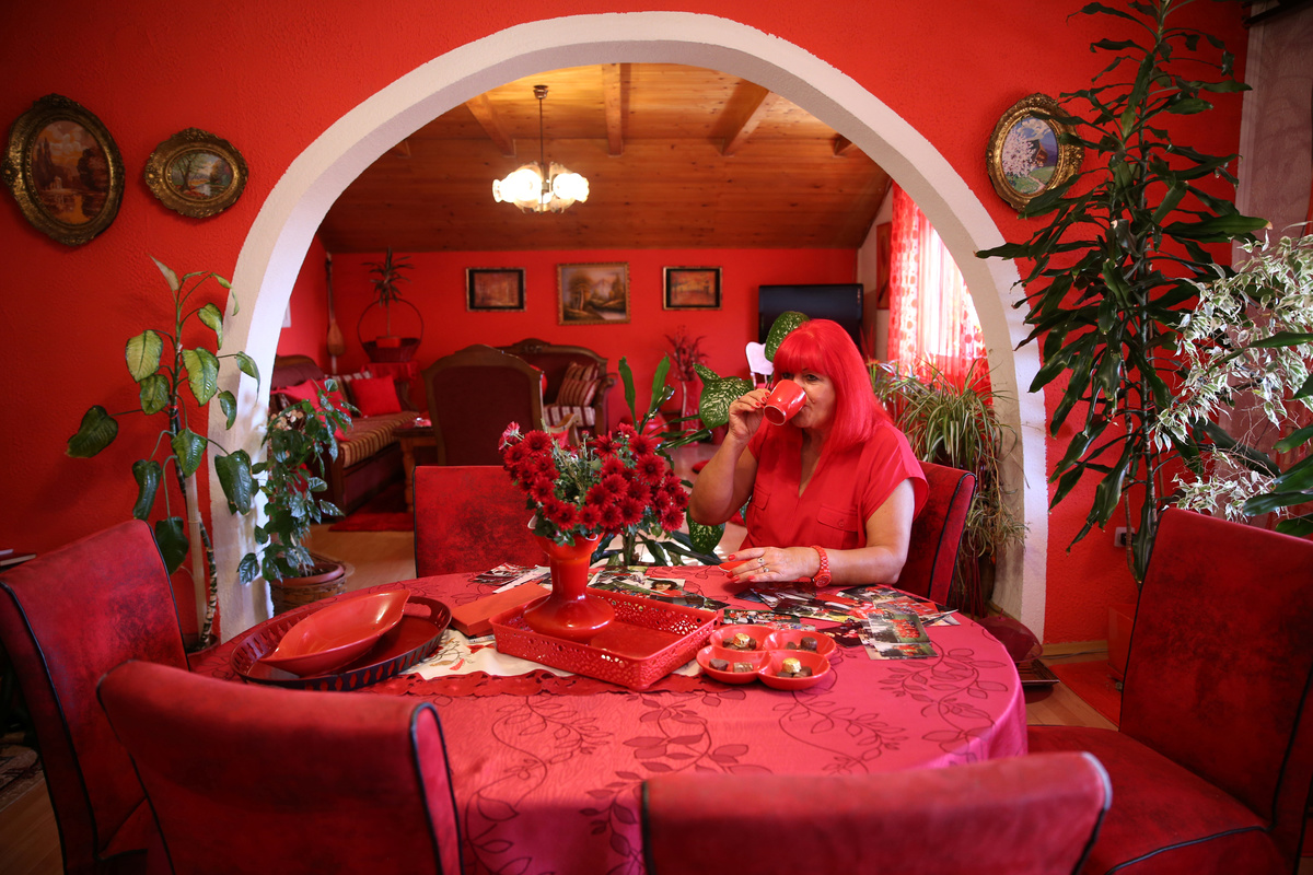 The retired schoolteacher lives in a red house, where she and Zoran eat from red plates, drink from red glasses and sleep in red bedding. Even her hair is dyed red.