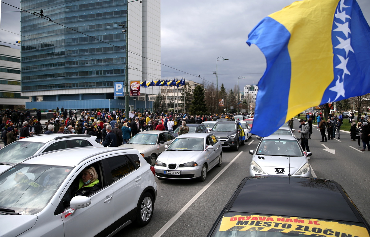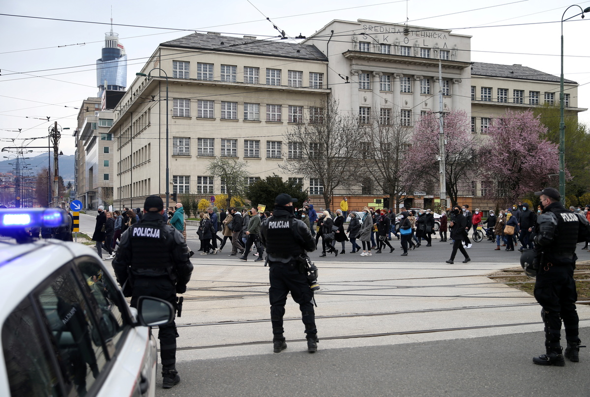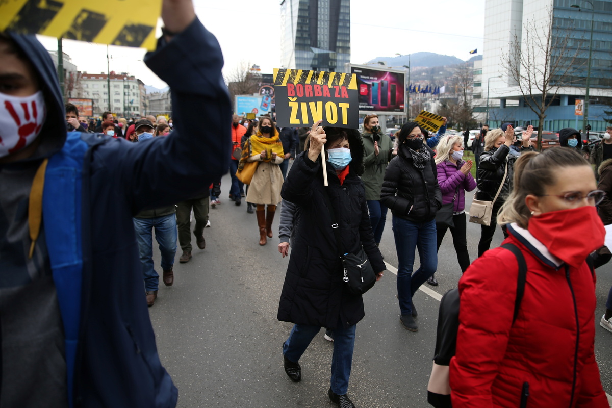 Protesters marched through the city centre carrying placards reading "The Fight for Life" and "Resignations and Vaccines", while others drove in a motorcade, honking their car horns in support. A spokesman for Sarajevo police estimated that about 500 people joined the march and at least 300 people were in the motorcade of about 150 cars.