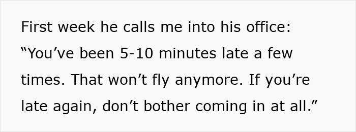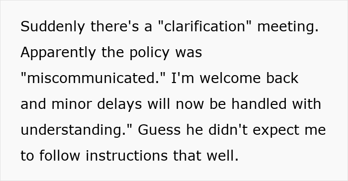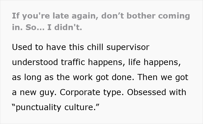 However, everything changed for one employee when a new supervisor arrived, bringing with him an obsession with “punctuality culture.” What followed was a textbook case of malicious compliance, where strict rules were followed a little too perfectly. It’s the kind of story that makes you cringe, cheer, and maybe even slow clap.