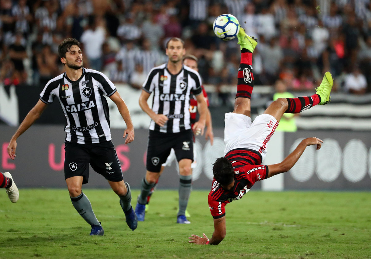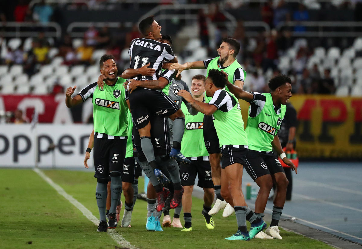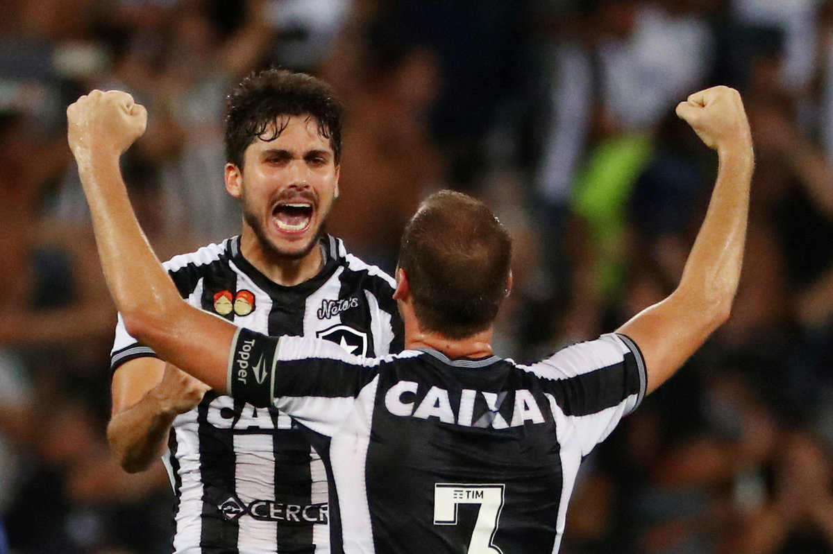 Soccer Football - Brasileiro Championship - Botafogo v Flamengo - Nilton Santos stadium, Rio de Janeiro, Brazil - November 10, 2018 Botafogo's Erik celebrates scoring their first goal with team mates REUTERS/Pilar OlivaresSoccer Football - Brasileiro Championship - Botafogo v Flamengo - Nilton Santos stadium, Rio de Janeiro, Brazil - November 10, 2018 Flamengo's Cuellar in action with Botafogo's Luiz Fernando REUTERS/Pilar OlivaresSoccer Football - Brasileiro Championship - Botafogo v Flamengo - Nilton Santos stadium, Rio de Janeiro, Brazil - November 10, 2018 Botafogo's Brenner in action with Flamengo's Leo Duarte REUTERS/Pilar Olivares