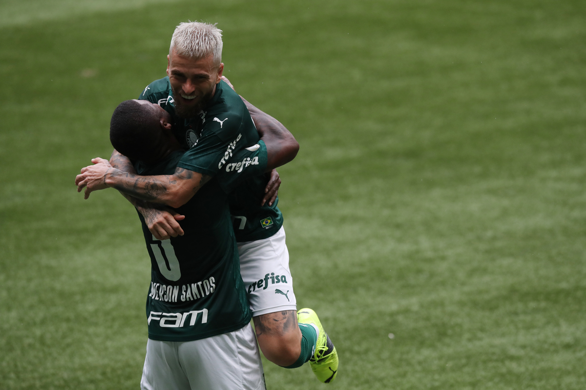 Soccer Football - Brasileiro Championship - Palmeiras v Botafogo - Allianz Parque, Sao Paulo, Brazil - February 2, 2021 Palmeiras' Emerson Santos celebrates scoring their first goal with Lucas Lima REUTERS/Amanda Perobelli