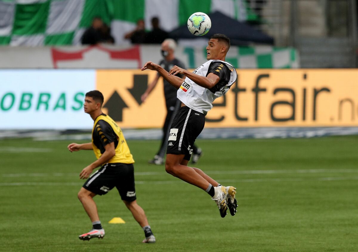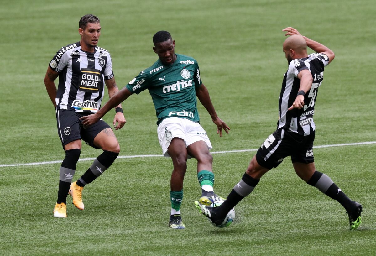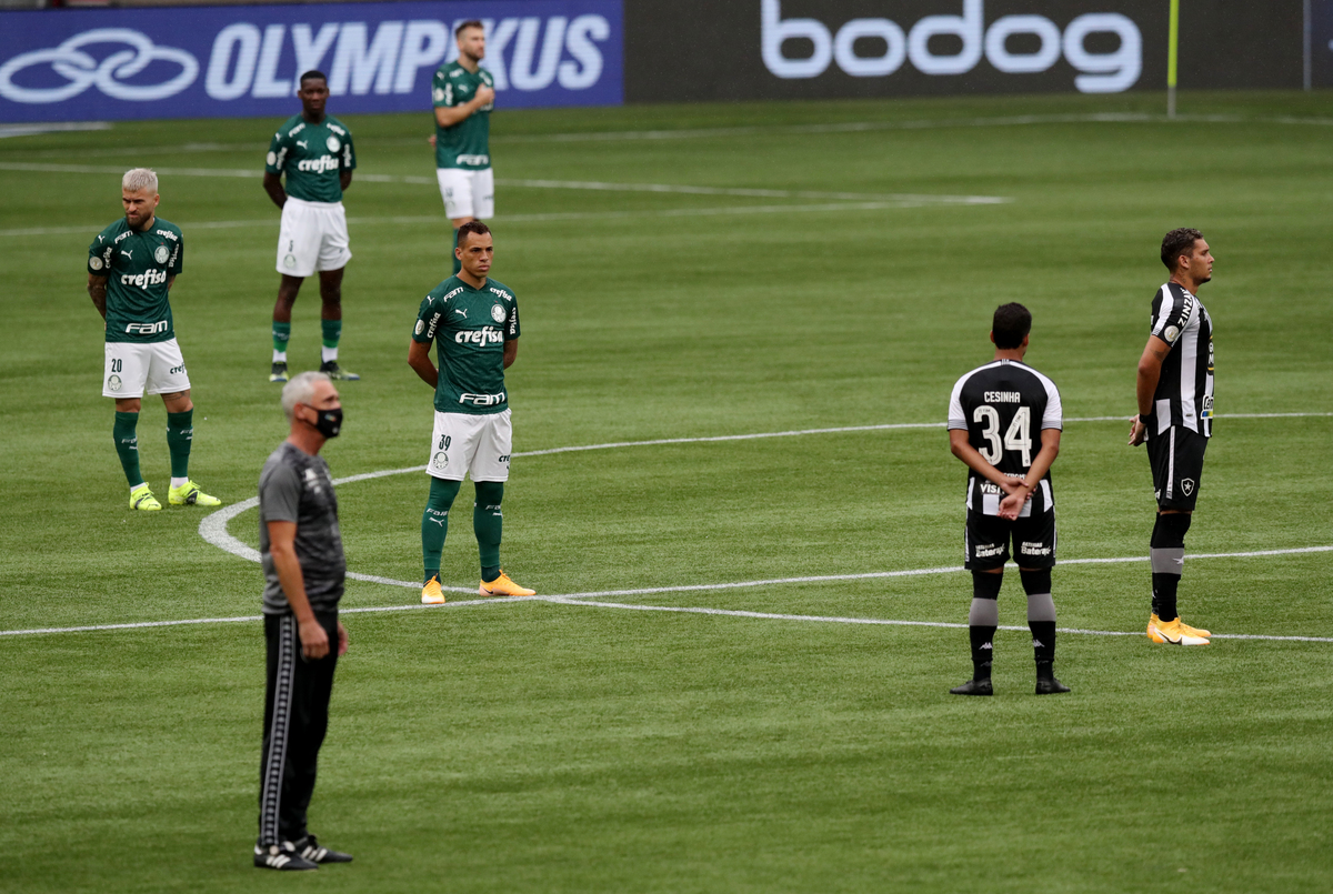 Soccer Football - Brasileiro Championship - Palmeiras v Botafogo - Allianz Parque, Sao Paulo, Brazil - February 2, 2021 Palmeiras' Patrick De Paula in action with Botafogo's Rafael Navarro Leal and Jose Welison REUTERS/Amanda PerobelliSoccer Football - Brasileiro Championship - Palmeiras v Botafogo - Allianz Parque, Sao Paulo, Brazil - February 2, 2021 Palmeiras and Botafogo players stand for the national anthem before the match REUTERS/Amanda Perobelli
