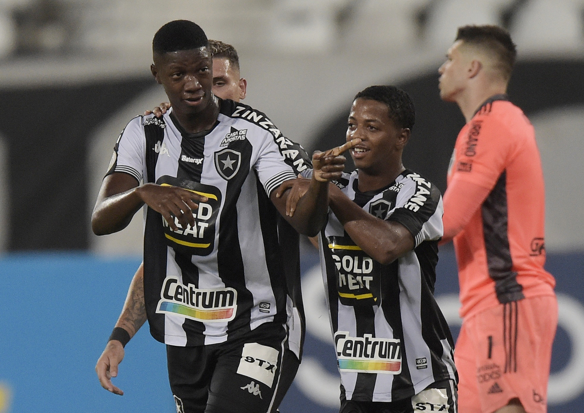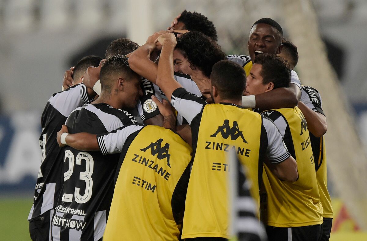 Soccer Football - Brasileiro Championship - Botafogo v Sao Paulo - Estadio Nilton Santos, Rio de Janeiro, Brazil - February 22, 2021 Botafogo's Matheus Babi celebrates scoring their first goal with teammates REUTERS/Alexandre Loureiro