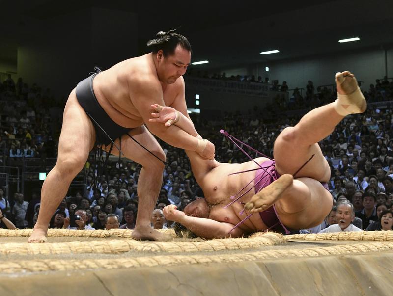 Fellow yokozuna Hakuho exchanged shoves and slaps with top-ranked maegashira Hokutofuji after the jump-off. The yokozuna, though, eventually latched onto his opponent's mawashi with both hands and sent the winless maegashira down with a twisting arm throw.