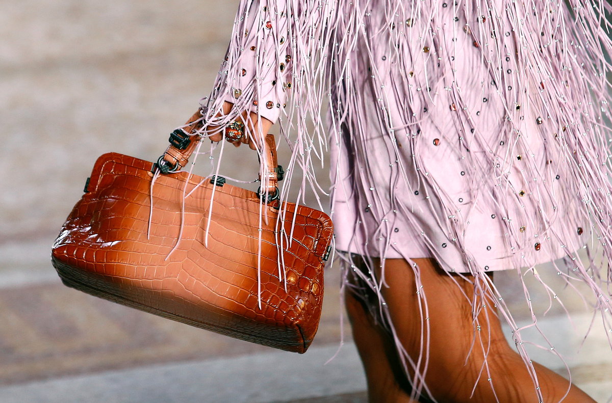 Some of the clothes had inlays of the brand's signature "intrecciato", or woven leather, or other details with exotic animal skins.