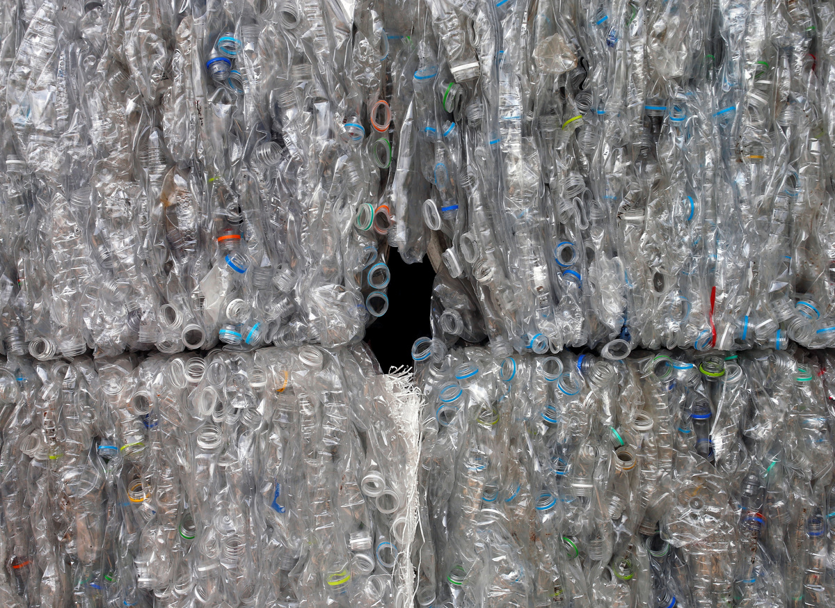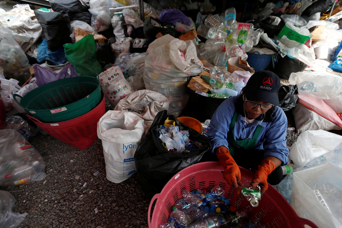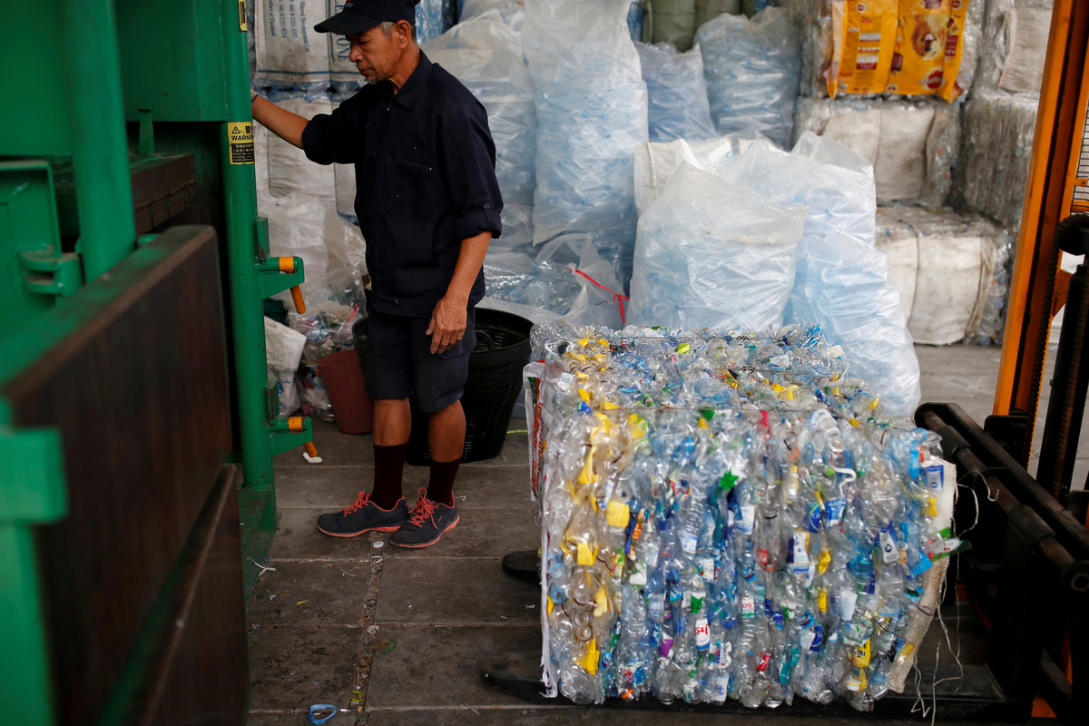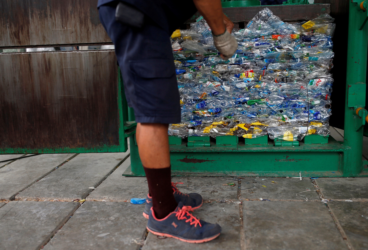 At a Buddhist temple south of Bangkok, a monk watches as a machine presses down on thousands of water bottles, before a giant bale of crushed plastic rolls out with a thud.