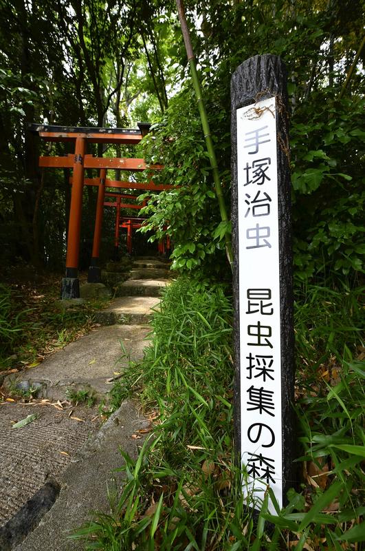 The whole zone is now a residential area, but a small forest is in sight. It's called "Senkichi Inari no Mori" (Forest of Senkichi Inari shrine). At the entrance of the shrine is a monument bearing the words "Tezuka Osamu Konchu Saishu no Mori," or "a forest where Osamu Tezuka collected insects."