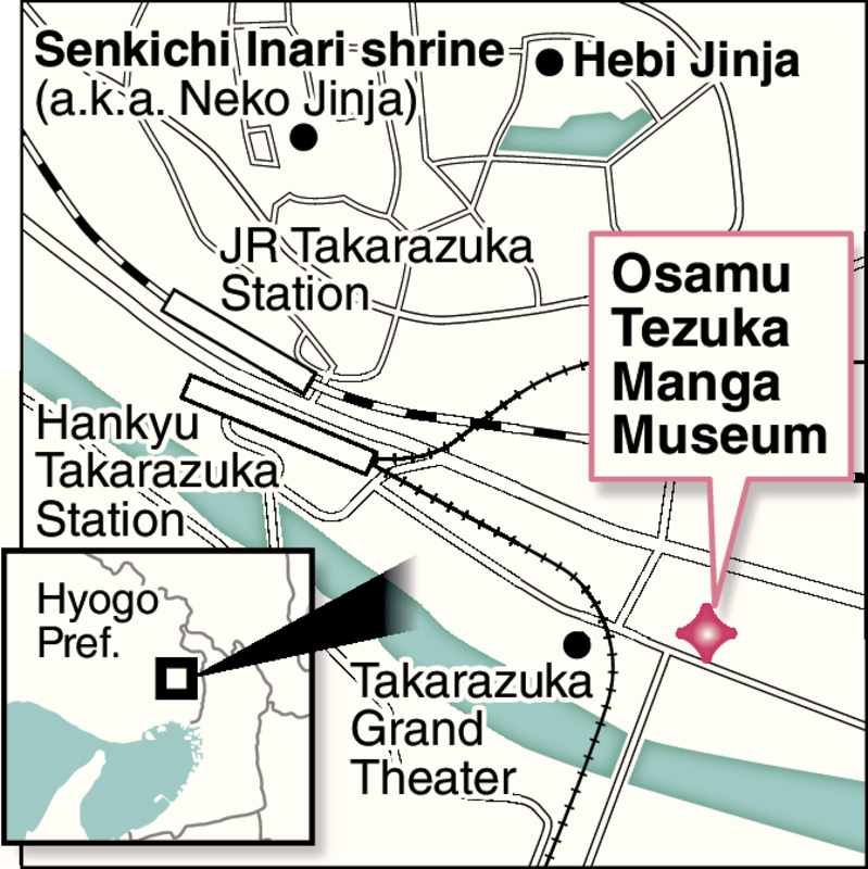 Tezuka lived in Takarazuka for about 20 years from the age of 5. There are a number of spots related to the manga artist around the train stations in Takarazuka, including those nicknamed Neko Jinja (Cat shrine) and Hebi Jinja (Snake shrine).